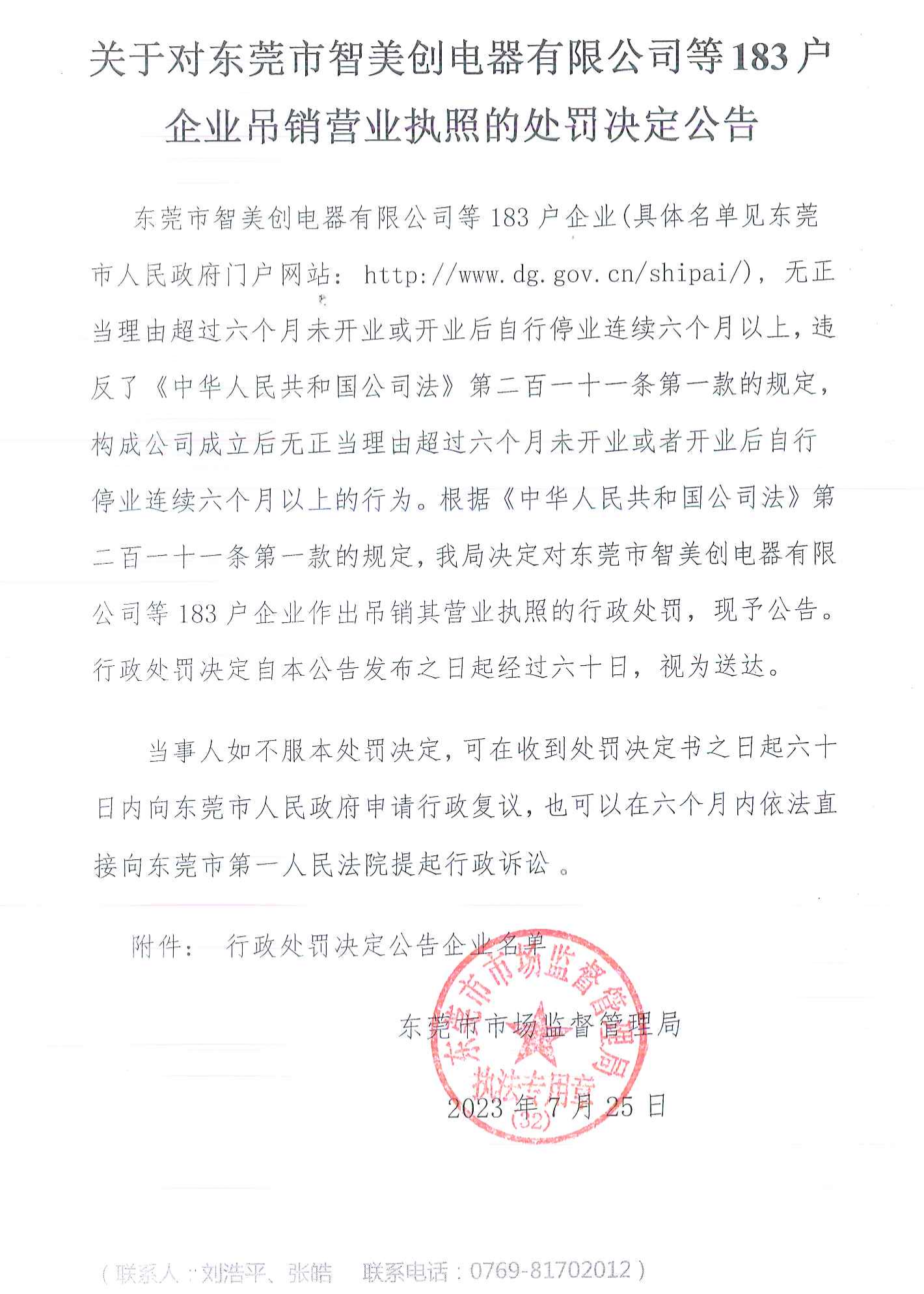 关于对东莞市智美创电器有限公司等183户企业吊销营业执照的处罚决定公告