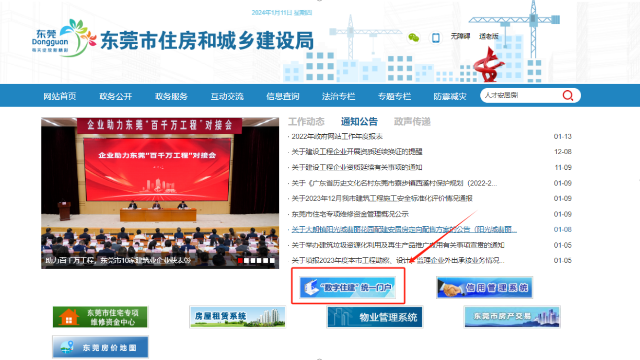 申购人可在2024年2月1日至2月29日登录网址:东莞市住房和城乡建设局,点击“数字住建”统一门户图标进入,如下图: