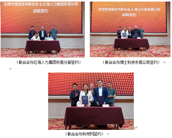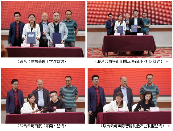 随后,联合会与东莞理工学院、松山湖国际创新创业社区、百度(东莞)、国际智能制造产业联盟、红海人力集团东莞分部、博士科技东莞公司、科兜网进行现场签约仪式。