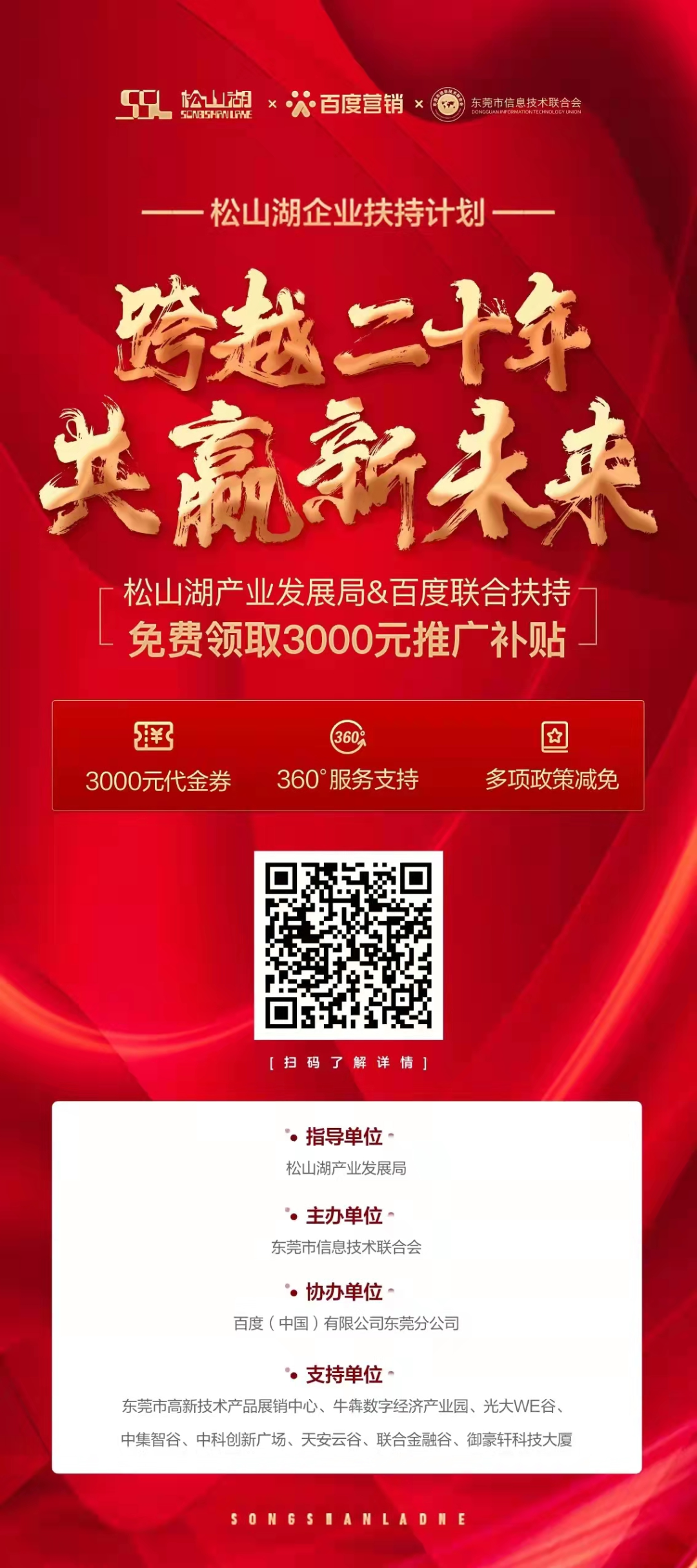 正值松山湖成立20周年,为帮助企业适应常态化线上市场拓展需求,推动松山湖企业加速进入新媒体赛道,拓宽产品获客渠道,由松山湖产业发展局指导、东莞市信息技术联合会主办、百度(中国)有限公司东莞分公司协办的“2021松山湖企业扶持计划——跨越二十年,共赢新未来”的政府补贴扶持企业计划正式开启!活动将于2021年11月12日下午2点在东莞市松山湖牛犇数字经济产业园举行线下宣讲会,进行扶持政策解读,诚邀各企业报名参加,名额有限,扫码了解详情: